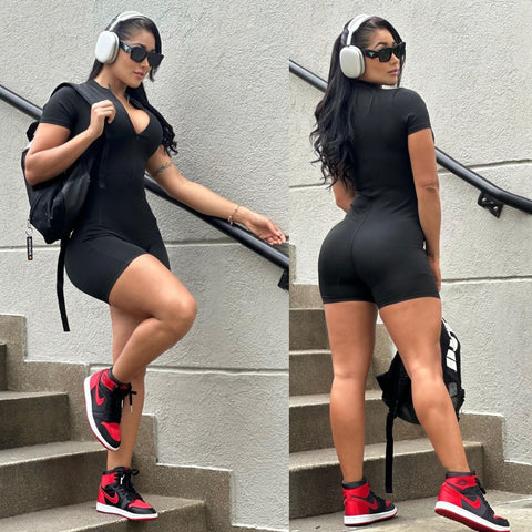 Este enterizo corto con manga corta es la combinación perfecta de comodidad y estilo. Su diseño moderno y suave tela lo hacen ideal para cualquier ocasión.